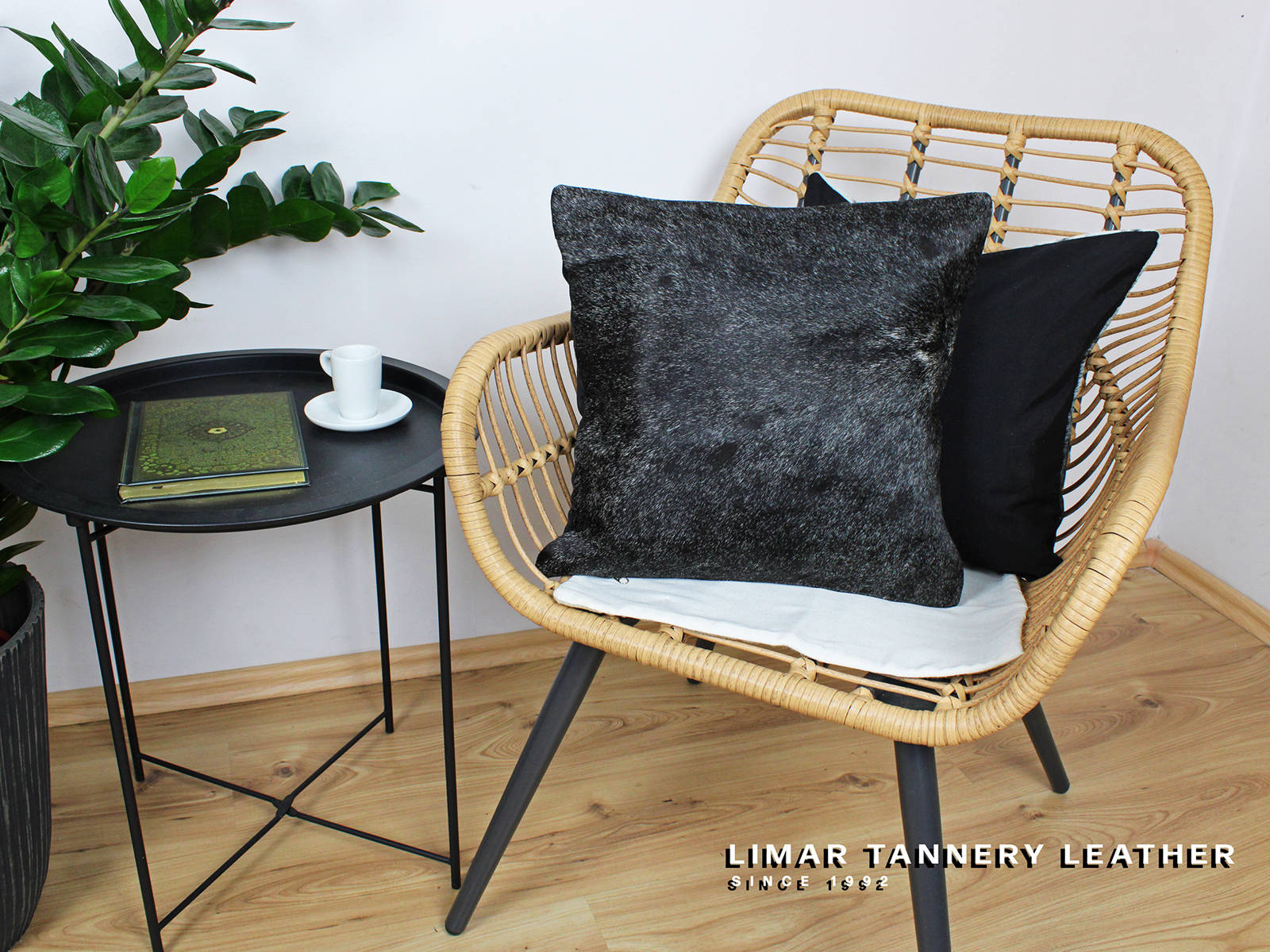 Elegancka poszewka na poduszkę Black Hide wykonana z naturalnej skóry bydlęcej i gładkiego materiału. Ekskluzywny dodatek wprowadzi do twojego domu odrobinę luksusu i nowoczesnej wizualizacji.