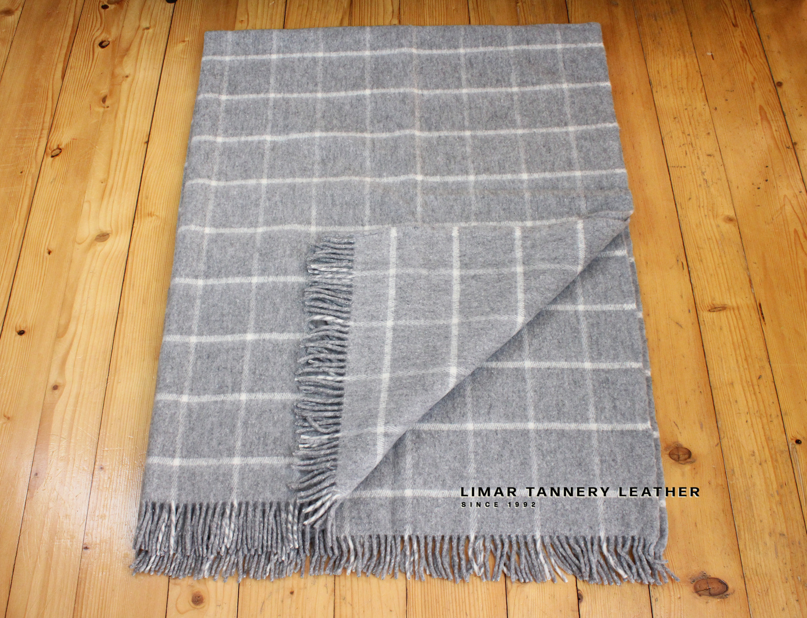 Koc wełniany z frędzlami szara kratka